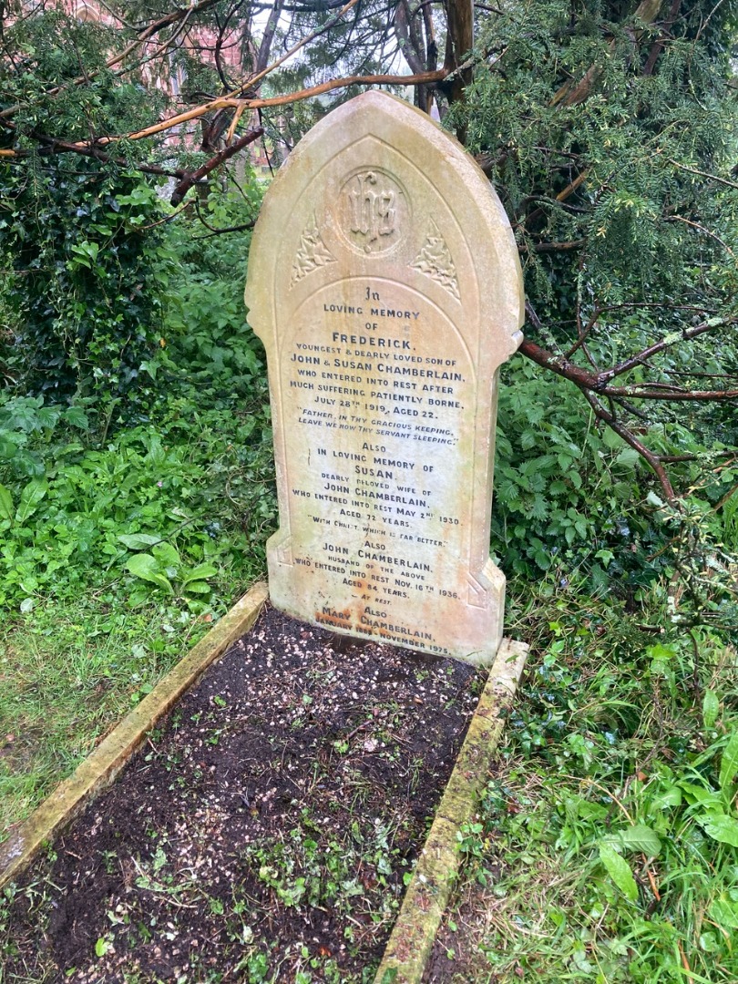 Frederick Chamberlin is listed on the war memorial and his grave (together with his surviving parents) is in the churchyard and maintained by the Commonwealth War Graves Commission. He had been given a medical discharge and died nine months after the armistice and because his illness was "caused or exacerbated by his war service" he is recognised as an official war grave. The role of honour in the church does not list him as having been killed in action, so was presumably prepared before he died. The location of the grave is in location G05 on the old graveyard map.